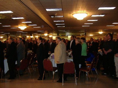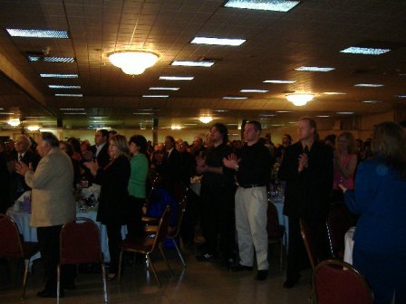 الذين غصت القاعة بهم على اقدامهم وهم يهتفون