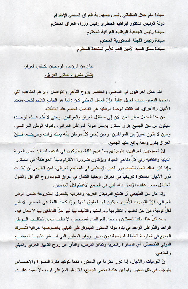 الاباء الروحيون لكنائس شعبنا الكلدوآشوري يوجهون بياناً