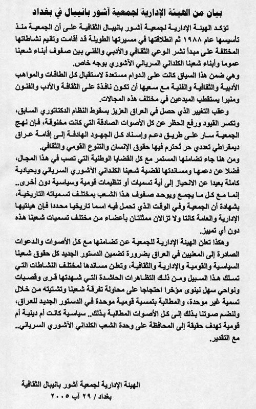 بيان من الهيئة الادارية لجمعية آشور بانيبال في بغداد