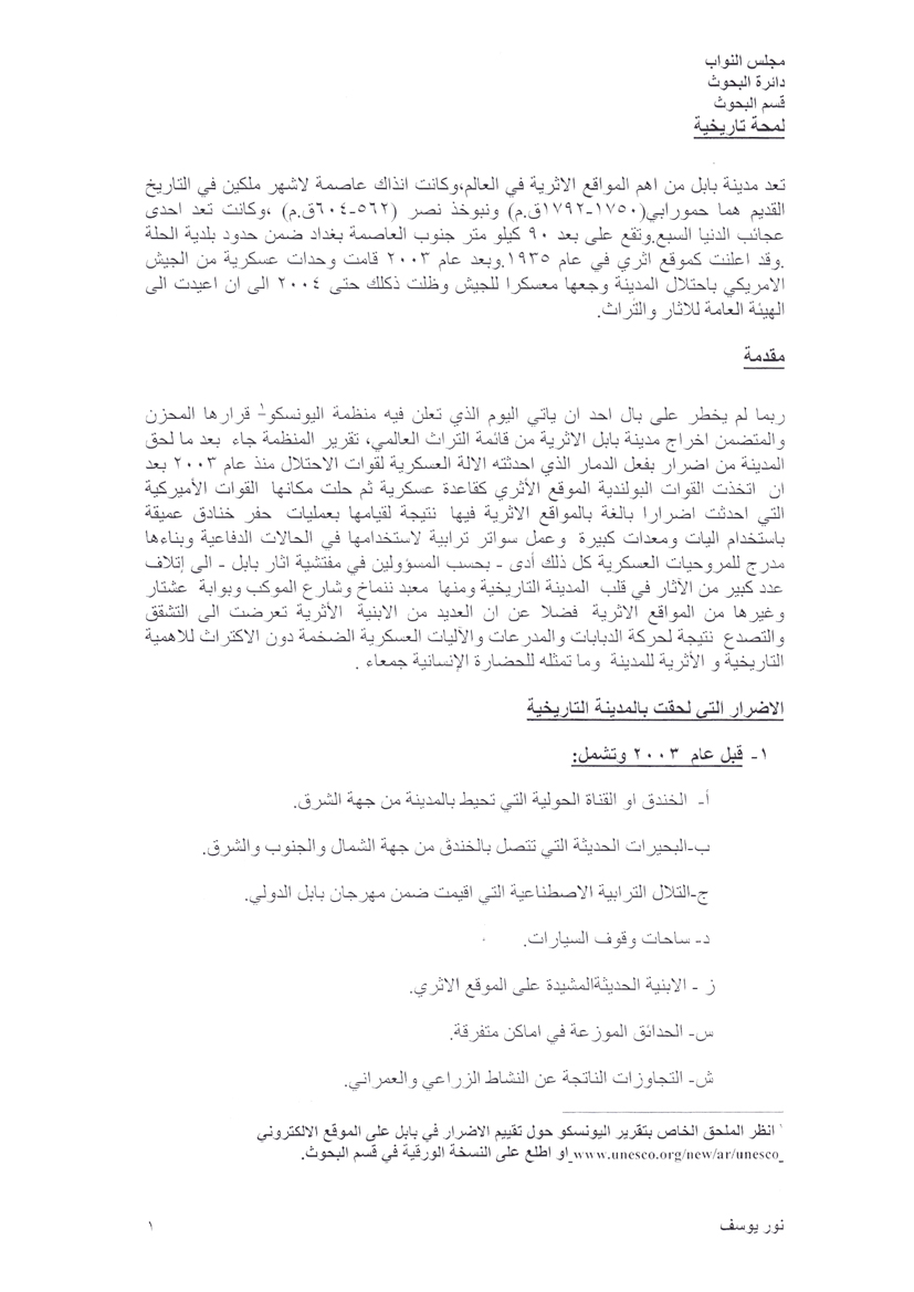مجلس النواب يناقش موضوع مدينة بابل الاثرية