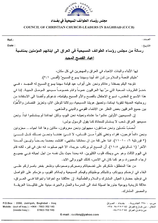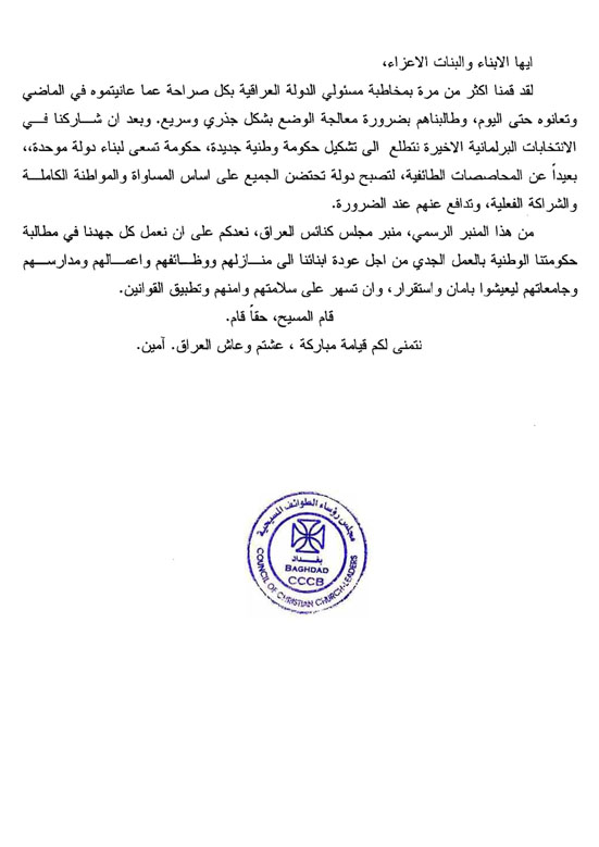 هنأ مجلس روؤساء الطوائف المسيحية في العراق ابناء شعبنا الكلداني السرياني الاشوري اعياد الفصح المجيد اليكم نص برقية التهنئة: