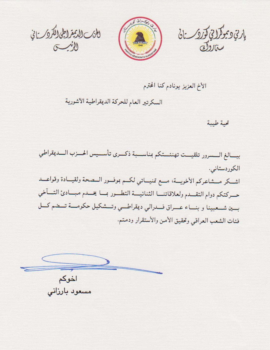 الديمقراطي الكوردستاني. أشكر مشاعركم الأخوية، مع تمنياتي لكم بموفور
