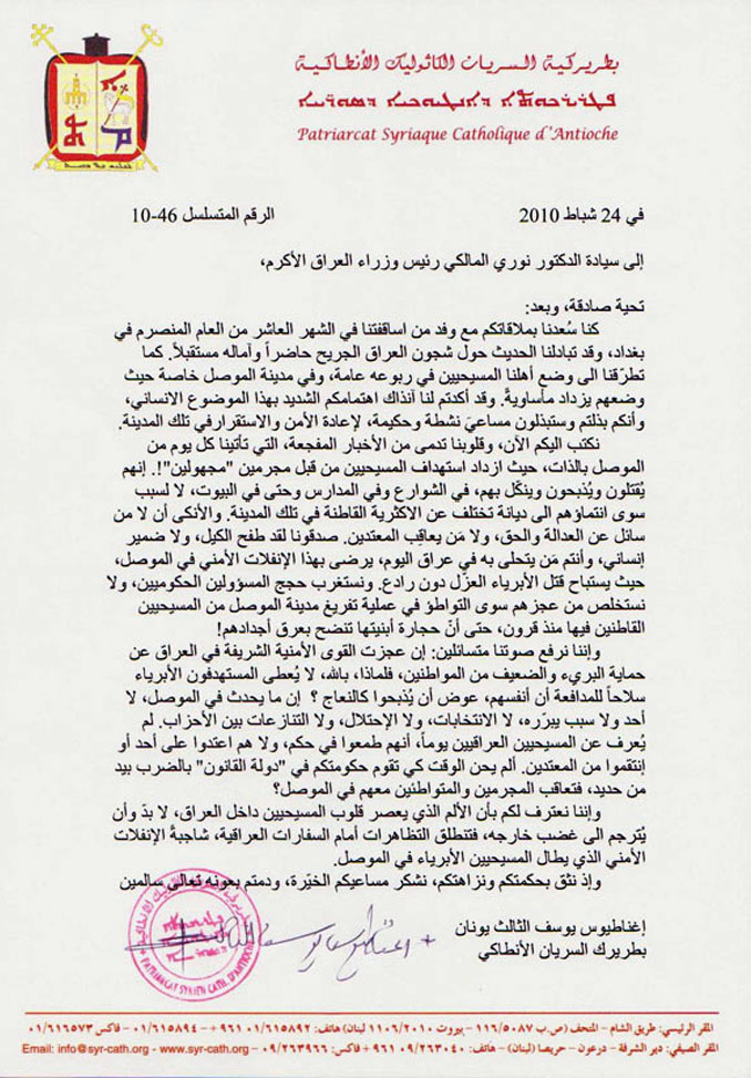 وجهت بطريركية السريان الكاثوليك الانطاكية رسالة احتجاج الى