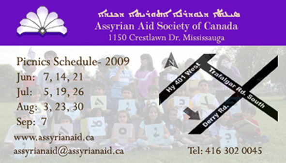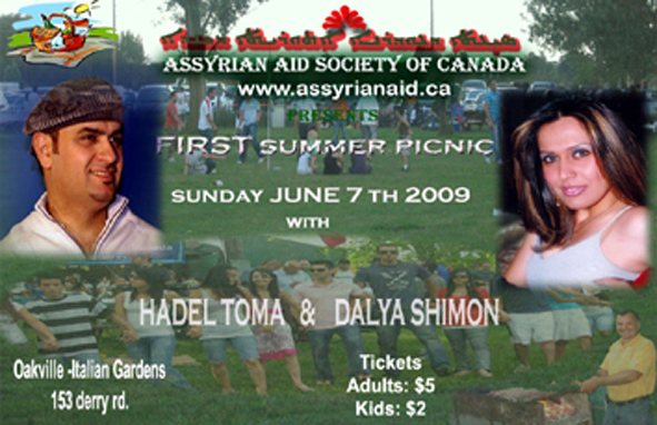 HOSTED BY ASSYRIAN AID SOCIETY OF CANADA PICNICS FOR SUMMER OF 2009 ARE STARTING THIS SUNDAY JUN 7TH, 2009 FEATURING HADEL TOMA & DALYA SHIMON @ OAKVILLE ITALIAN GARDENS 153 DERRY RD. TICKETS ADULTS: $5.00 KIDS: $2.00 AS ALWAYS, YOUR PARTICIPATION AND SUPPORT ARE MUCH APPRECIATED. for more information visit www.assyrianaid.ca Please find attached our picnics schedule and the first picnic flyer