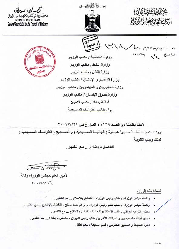 (الطوائف المسيحية)، وعمم الكتاب الى كافة الجهات ذات العلاقة، ونسخة منه