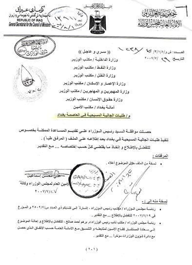 المسيحية في العاصمة بغداد) ولكونه (سرياً) تم الاطلاع عليه بعد اكثر من