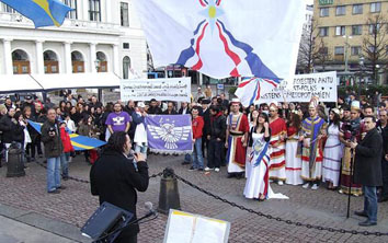 بألوان الربيع الزاهية رافعة الأعلام الآشورية والسويدية واللافتات التي