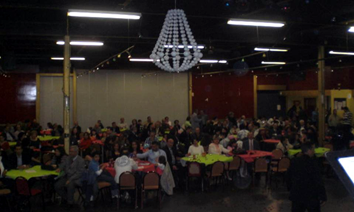 قاعة الاحتفال بالورود الحمراء وشموع الميلاد و شعارات تحيي بدأ الحفل