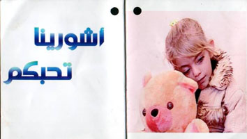 الموت وتحتضن دبها الناعم ومكتوب عليها عبارة (أشورينا تحبكم ) لتكون