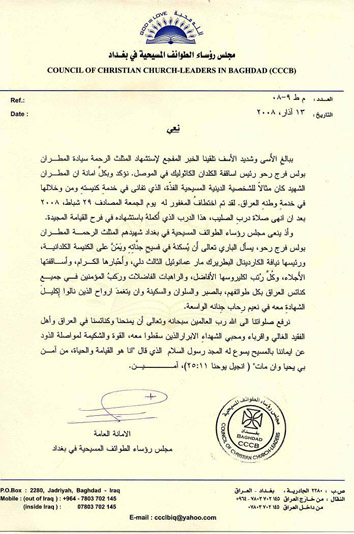 اصدرت الامانة العامة لمجلس رؤساء الطوائف المسيحية في بغداد نعيا لاستشهاد مثلث الرحمة المطران بولص فرج رحو هذه نسخة منه: