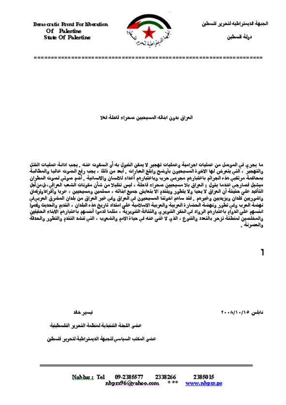 بيان استنكار من الجبهة الديمقراطيه لتحرير فلسطين