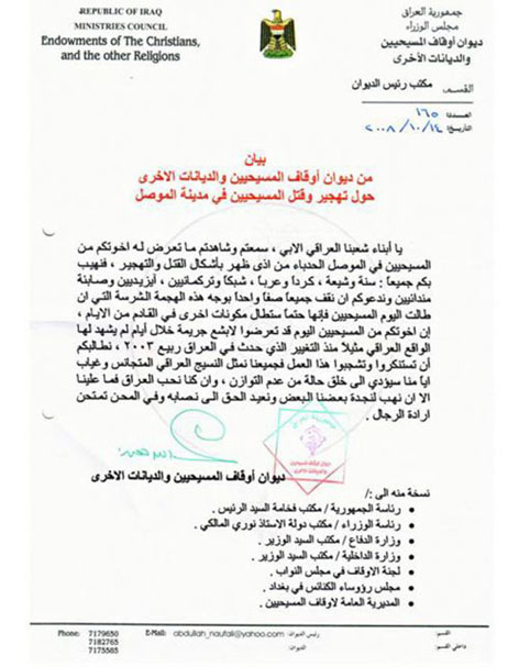 نسخة منه الى - رئاسة الجمهورية. - رئاسة الوزراء. - وزارة الدفاع - وزارة الداخلية - لجنة الاوقاف في مجلس النواب. - مجلس رؤوساء الكنائس في بغداد. - المديرية العامة لأوقاف المسيحيين. نص البيان كما جاء في موقع ديوان أوقاف المسيحيين والديانات الاخرى على شبكة المعلومات الدولية (الانترنت). http://www.cese-iq.net/Documents/f_2.htm موقع ديوان أوقاف المسيحيين والديانات الأخرى على شبكة المعلومات الدولية (الانترنت)