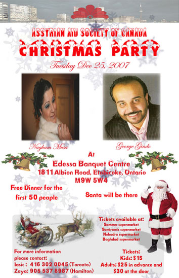 تقيم اللجنة الخيرية الآشورية - كندا وبمناسبة اعياد الميلاد وراس السنة الميلادية الجديدة حفلا فنيا في مركز اديسا للمناسبات وذلك يوم الخامس والعشرون من هذا الشهر يحيه كل من الفنانين جورج جندو و نغم ادور موسى....
