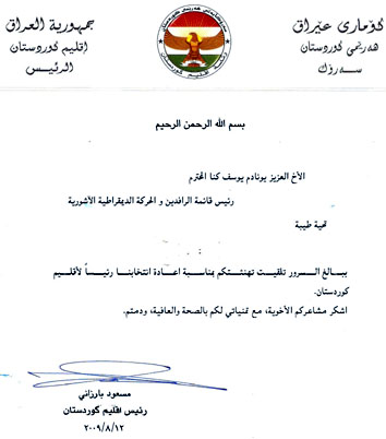 بعث السيد مسعود البارزاني رئيس اقليم كوردستان برقية جوابية الى السيد يونادم كنا عضو مجلس النواب العراقي السكرتير العام للحركة الديمقراطية الآشورية ،اليكم نسخة منها: