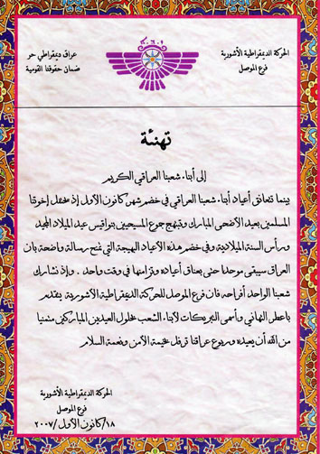 زوعا - الموصل بمناسبة عيد الاضحى المبارك واعياد الميلاد المجيدة وراس السنة بعث فرع الموصل لحركتنا بطاقة تهنئة الى ابناء شعبنا العراقي كافة هذا نصها: