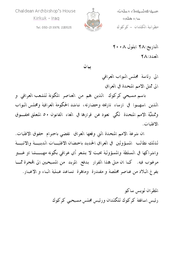 المطران لويس ساكو رئيس اساقفة كركوك ورئيس مجلس مسيحيي كركوك بيانا حول