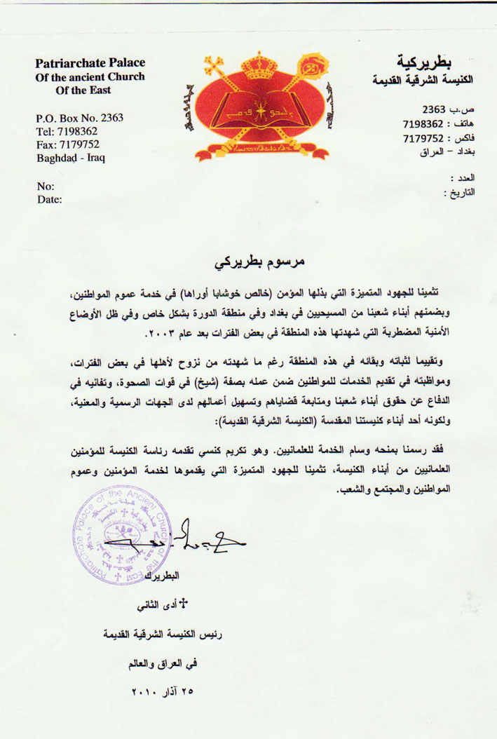 العراقية، ومن ثم هذا التكريم من لدن قداسة البطريرك. هذا وحضر مراسيم
